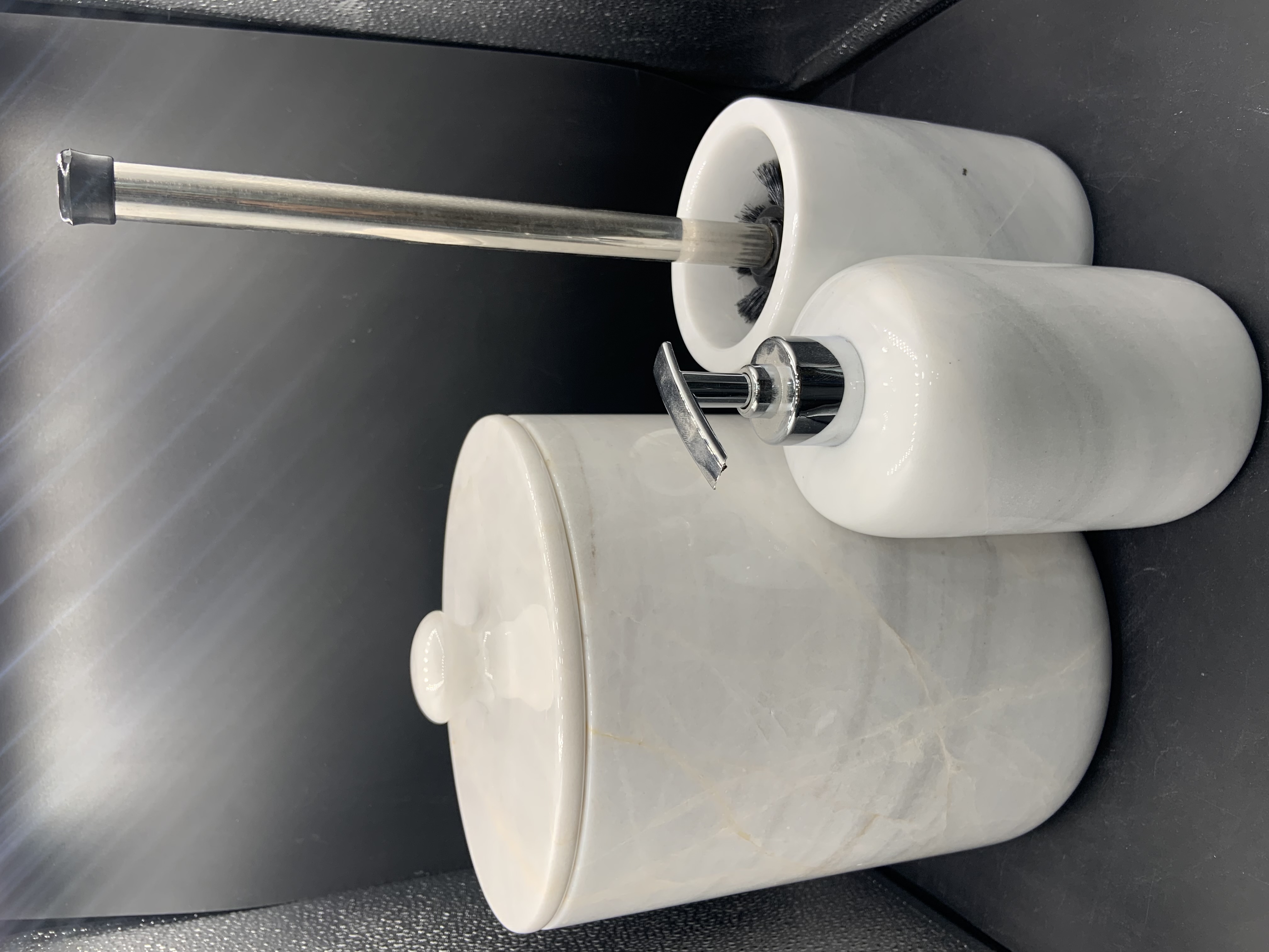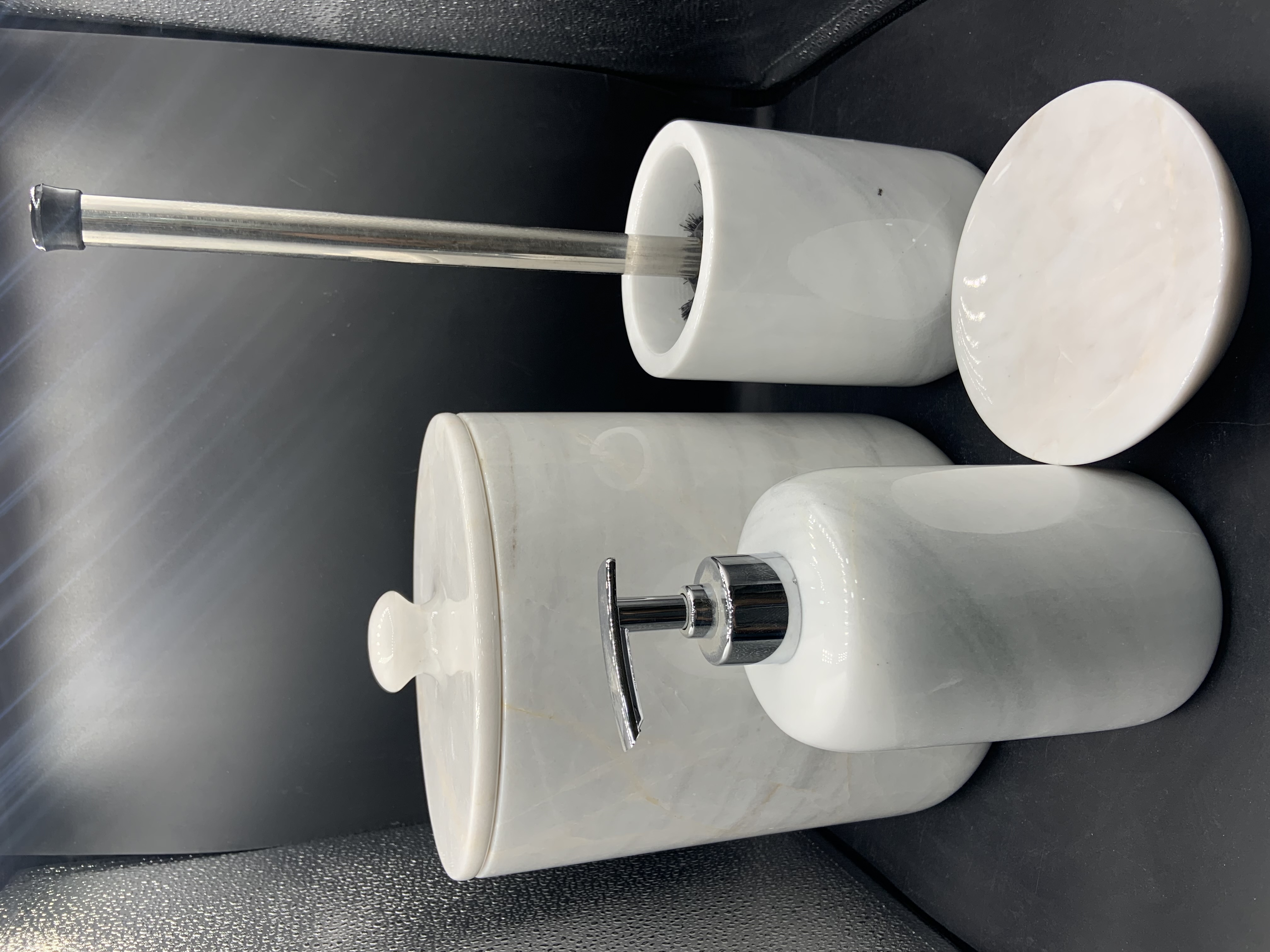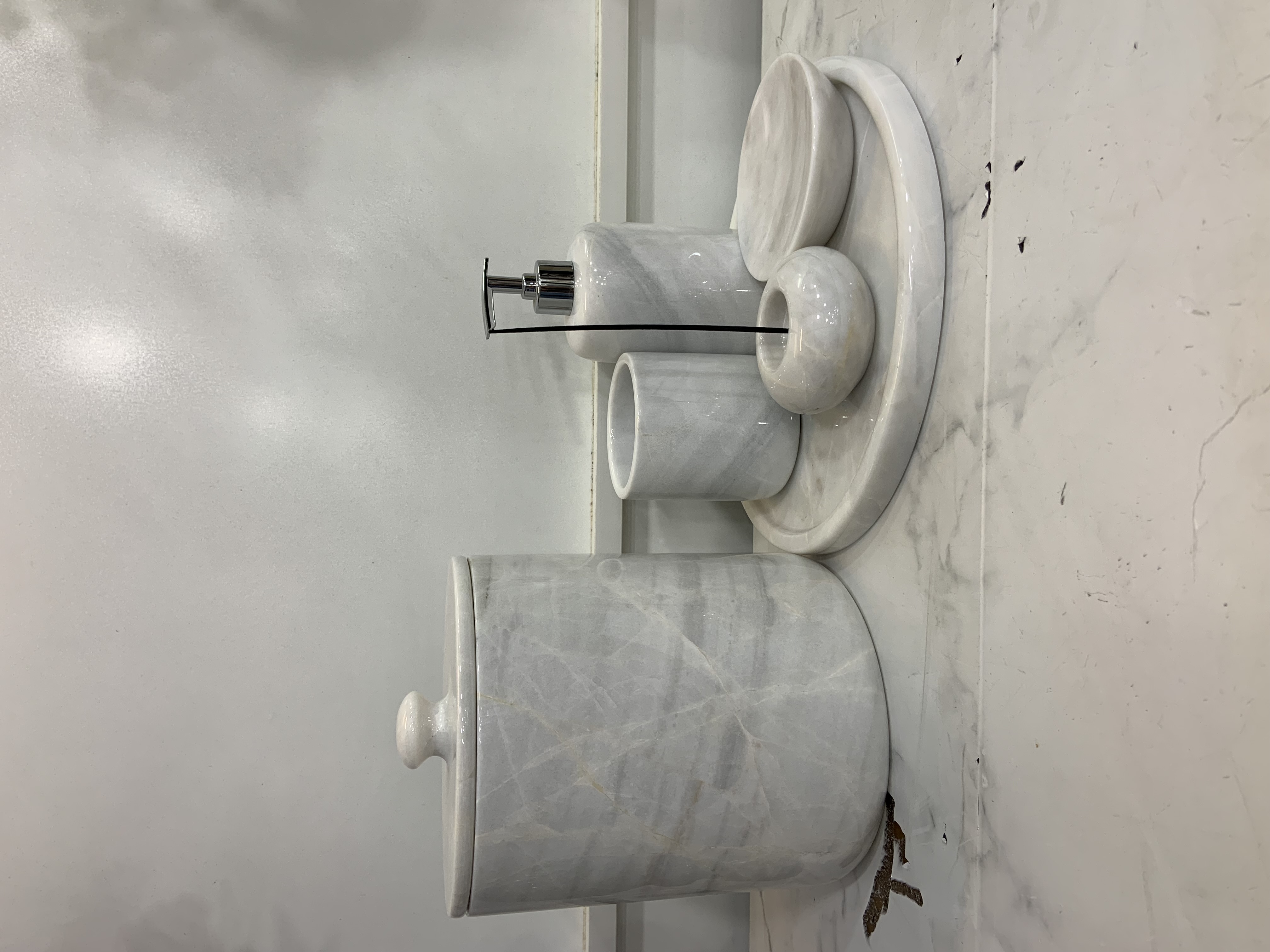 سطل زباله،جامسواکی، جای فرچه،جای صابون،جایع مایع دستشویی ،سینی گرد قطر حدود ۳۰سانتیمتر،جاعودی